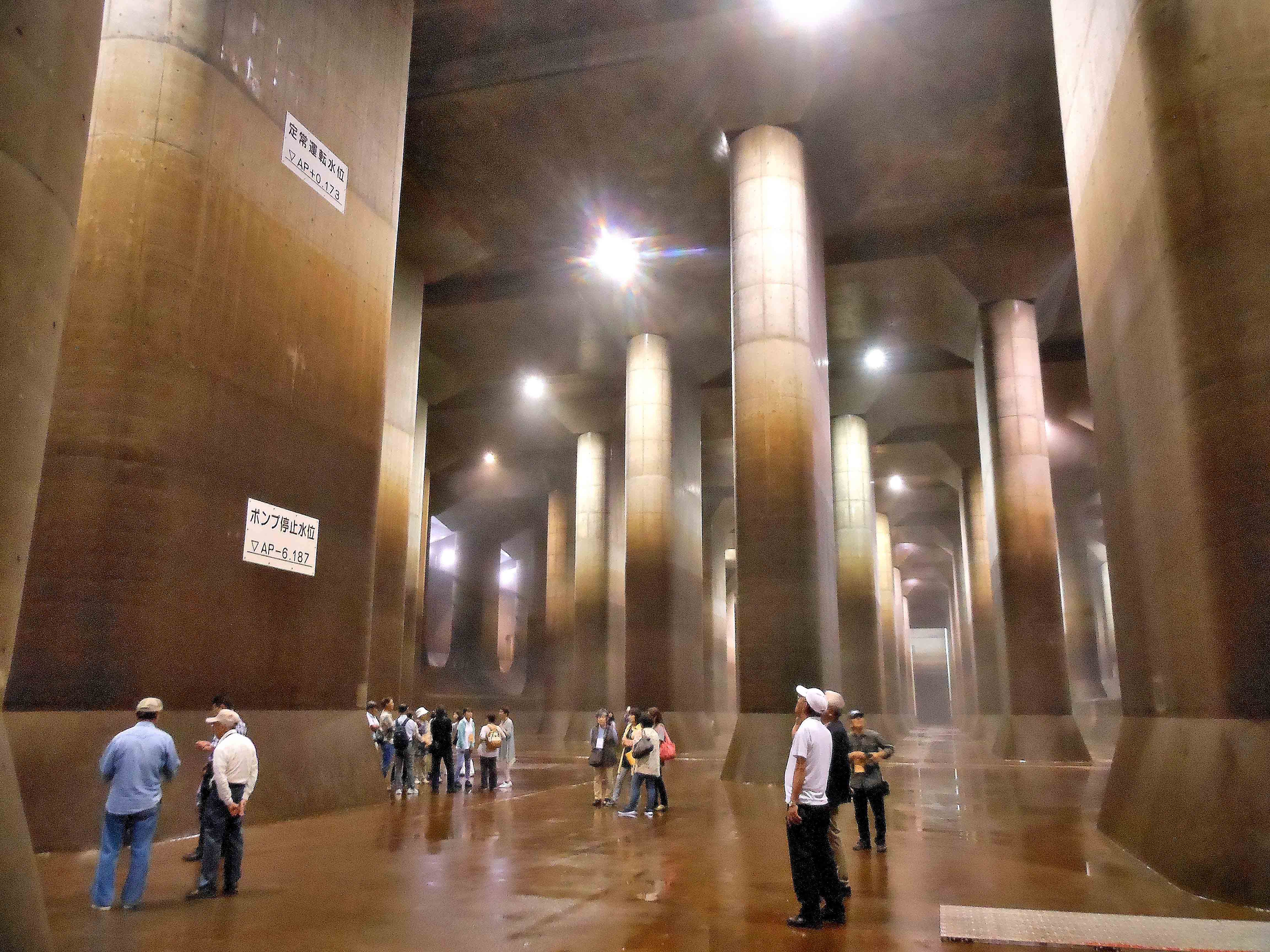 首都圏外郭放水路は江戸川とその付近の中小河川を地下で結んだものです。大雨時に中小河川流域の雨水を江戸川に放流し洪水被害を低減させます。平成18年に完成しました。地下の調圧水槽は長さ177m、幅78m、高さ18mの巨大なもので、さながら地下神殿のようです。
